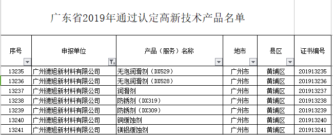 根據(jù)《關于組織申報廣東省2019年高新技術產(chǎn)品認定的通知》(粵高企協(xié)〔2019〕7號)的要求,經(jīng)企業(yè)申報、專家評審、擬公示等規(guī)定程序,我司“無泡潤滑劑(DX529)”、“無泡潤滑劑(DX528)”、“潤滑劑”、“防銹劑(DX319)”、“防銹劑(DX309)”、“銅緩蝕劑”、“鎂鋁緩蝕劑”7款產(chǎn)品被認定為廣東省2019年高新技術產(chǎn)品。